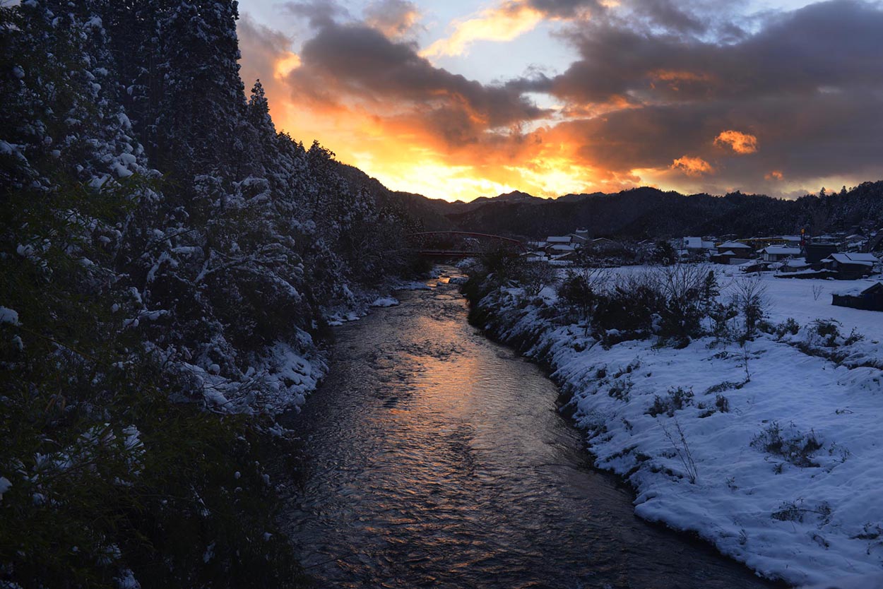Miyama is located about 50km north of Kyoto City, about an hour and 15 minutes by car. The crystal clear waters of the Sea of ​​Japan are about a 45 minute drive away. Surrounded by mountains with 800-900m height above sea level, Miyama has no railroads. The area has not seen much development, and is known for its untouched natural beauty and traditional architecture, such as thatched roof houses. There are no convenience stores, supermarkets, family restaurants, or clothing chain stores, which are common sights in Japan even in countryside. It can be described as an isolated island on land. Perhaps due to the mountains surrounding Miyama although the amount of snow is decreasing year by year, it is still designated as a heavy snow area. Although the temperature rises as high as Kyoto City during the summer daytime, you can sleep at night without air conditioning. If the weather is good, Miyama nights are filled with stars. On some summer days, you can even see the Milky Way. The Yura River, which flows into the Sea of ​​Japan in Kyoto, originates in Miyama and is called the Miyama River here. The Miyama River and its tributaries are beautiful, with fireflies flying in early summer, attracting many people to swim and enjoy the river. However, Miyama’s population continues to decline, with the population of 10,000 in 1960 falling to 5,500, 30 years later in 1995, and then to 3,200, 30 years after that in 2025. Furthermore, with over 50% of the population being 65 years old or older, Miyama can be considered a marginal community.